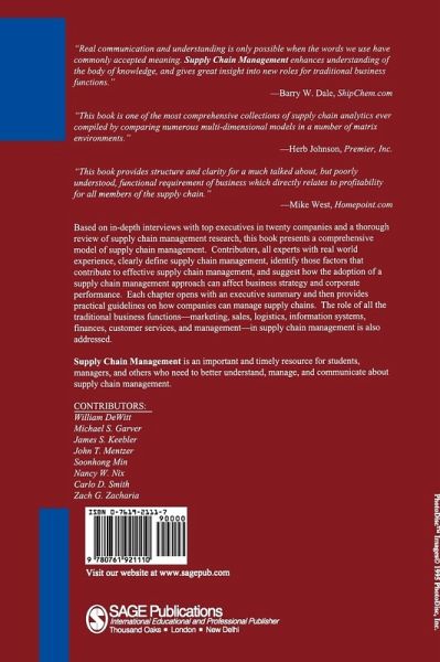 Presenting a comprehensive model of supply chain management, experienced executives from 20 companies clearly define supply chain management, identifying those factors that contribute to its effective implementation. They provide practical guidelines on how companies can manage supply chains, addressing the role of all the traditional business functions in supply chain management and suggest how the adoption of a supply chain management approach can affect business strategy and corporate performance.