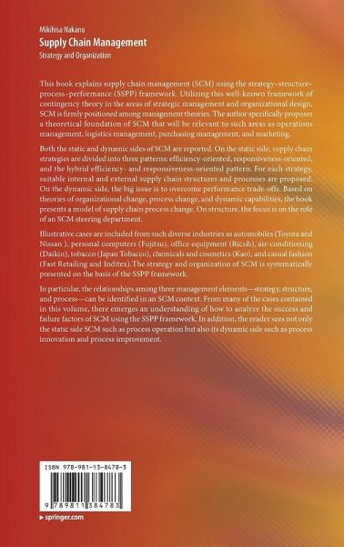 This book explains supply chain management (SCM) using the strategy-structure-process-performance (SSPP) framework. Utilizing this well-known framework of contingency theory in the areas of strategic management and organizational design, SCM is firmly positioned among management theories. The author specifically proposes a theoretical foundation of SCM that will be relevant to such areas as operations management, logistics management, purchasing management, and marketing.