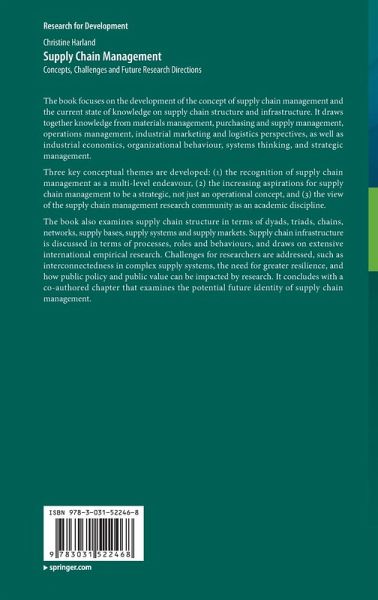 The book also examines supply chain structure in terms of dyads, triads, chains, networks, supply bases, supply systems and supply markets. Supply chain infrastructure is discussed in terms of processes, roles and behaviours, and draws on extensive international empirical research. Challenges for researchers are addressed, such as interconnectedness in complex supply systems, the need for greater resilience, and how public policy and public value can be impacted by research. It concludes with a co-authored chapter that examines the potential future identity of supply chain management.