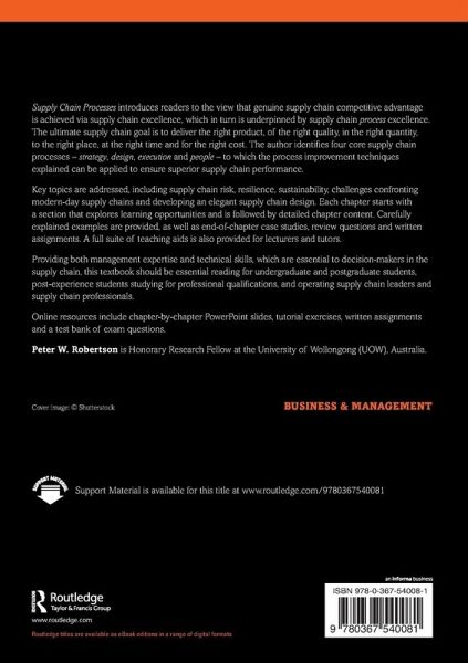 Supply Chain Processes¿introduces readers to the view that genuine supply chain competitive advantage is achieved via supply chain excellence which in turn is underpinned by supply chain process excellence. The ultimate supply chain goal is to deliver the right product, of the right quality, in the right quantity, to the right place, at the right time and for the right cost. The author identifies four core supply chain processes - strategy, design, execution and people - to which the process¿improvement¿techniques explained can be applied to ensure superior supply chain performance. Key topics are addressed, including supply chain risk, resilience, sustainability, challenges confronting modern-day supply chains and developing an elegant supply chain design. Each chapter starts with a section that explores learning opportunities and is followed by detailed chapter content. Carefully explained examples are provided, as well as end of chapter case studies, review questions and written assignments. A full suite of teaching aids is also provided for lecturers and tutors. Providing both management expertise and technical skills, which are essential to decision-makers in the supply chain, this textbook should be essential reading for undergraduate and post-graduate students, post-experience students studying for professional qualifications, and operating supply chain leaders and supply chain professionals. Online resources include chapter-by-chapter PowerPoint slides, tutorial exercises, written assignments and a test bank of exam questions.