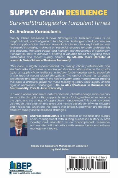 This book navigates us through thick and thin and gives us a holistic description of what is supply chain resilience, which are the factors that affect it, and which are the most effective resilience strategies that we need to implement in our supply chains in order to survive during turbulent times. In a world where pandemics, natural disasters, climate change, and wars are only some of the disruptions that supply chains are facing, resiliency has become the alpha and the omega of supply chain management. his book navigates us through thick and thin and gives us a holistic description of what is supply chain resilience, which are the factors that affect it, and which are the most effective resilience strategies that we need to implement in our supply chains in order to survive during turbulent times. The book is divided into three distinct parts. In the first one discusses the term supply chain resilience-its importance, its components, and the most important supply chain resilience metrics. The author presents real life examples of well-known companies which were successful in enhancing the resilience of their supply chains. The second part presents all the factors that can influence the resilience of a supply chain and concludes with discussions of seventeen supply chain resilience strategies which can be used by almost any company, in any industry, in any part of the world. This holistic approach on supply chain resilience makes this book unique. At the end of each chapter, professors will find a dedicated part which will assist them in managing their in-class interaction with students. This book can be used as an academic compendium or as a guide for supply chain professionals who want to cement the resilience of their supply chains and successfully navigate through crisis.