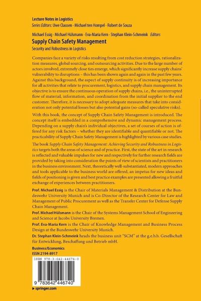 The book "Supply Chain Safety Management: Achieving Security and Robustness in Logistics" targets both the areas of science and of practice. First, the state of the art in research is reflected and valuable impulses for new and respectively for further research fields are provided by taking into consideration the points of view of scientists and practitioners in the business environment. Next, theoretically well-substantiated, modern approaches and tools applicable to the business world are offered, an impetus for new ideas and fields of positioning is given and best practice examples are presented allowing a fruitful exchange of experiences betweenpractitioners.