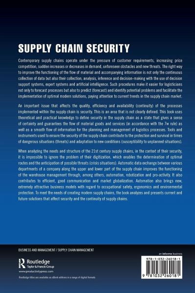 Contemporary supply chains operate under the pressure of customer requirements, increasing price competition, sudden increases or decreases in demand, unforeseen obstacles and new threats. The right way to improve the functioning of the flow of material and accompanying information is not only the continuous collection of data but also their collection, analysis, inference and decision-making with the use of decision support systems, expert systems and artificial intelligence. Such procedures make it easier for logisticians not only to forecast processes but also to predict (forecast) and identify potential problems and facilitate the implementation of optimal modern solutions, paying attention to current trends in the supply chain market. An important issue that affects the quality, efficiency and availability (continuity) of the processes implemented within the supply chain is security. This is an area that is not clearly defined. This book uses theoretical and practical knowledge to define security in the supply chain as a state that gives a sense of certainty and guarantees the flow of material goods and services (in accordance with the 7w rule) as well as a smooth flow of information for the planning and management of logistics processes. Tools and instruments used to ensure the security of the supply chain contribute to the protection and survival in times of dangerous situations (threats) and adaptation to new conditions (susceptibility to unplanned situations). When analyzing the needs and structure of the 21st century supply chains, in the context of their security, it is impossible to ignore the problem of their digitization, which enables the determination of optimal routes and the anticipation of possible threats (crisis situations). Automatic data exchange between various departments of the company along the upper and lower part of the supply chain improves the functioning of the warehouse management through, among others, automation, robotization and pro-activity. It also contributes to efficient, good communication and market globalization. Automation also brings new, extremely attractive business models with regard to occupational safety, ergonomics and environmental protection. To meet the needs of creating modern supply chains, the book analyzes and presents current and future solutions that affect security and the continuity of supply chains.