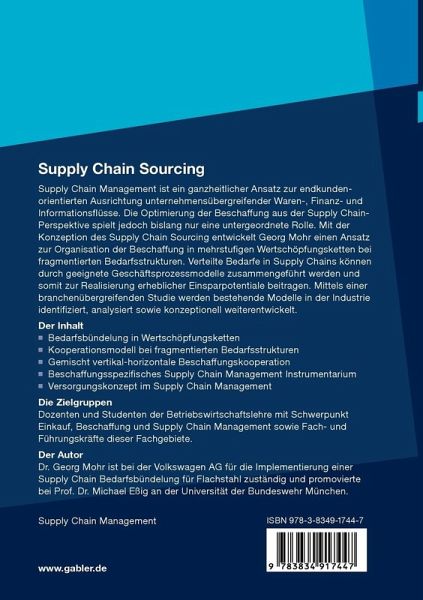 Supply Chain Management ist ein ganzheitlicher Ansatz zur endkundenorientierten Ausrichtung unternehmensübergreifender Waren-, Finanz- und Informationsflüsse. Die Optimierung der Beschaffung aus der Supply Chain-Perspektive spielt jedoch bislang nur eine untergeordnete Rolle. Mit der Konzeption des Supply Chain Sourcing entwickelt Georg Mohr einen Ansatz zur Organisation der Beschaffung in mehrstufigen Wertschöpfungsketten bei fragmentierten Bedarfsstrukturen. Verteilte Bedarfe in Supply Chains können durch geeignete Geschäftsprozessmodelle zusammengeführt werden und somit zur Realisierung erheblicher Einsparpotentiale beitragen. Mittels einer branchenübergreifenden Studie werden bestehende Modelle in der Industrie identifiziert, analysiert sowie konzeptionell weiterentwickelt.
