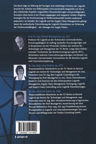 Prof. Dr.-Ing. Helmut Baumgarten, Jg. 1937 Professur für Logistik und Forschungstätigkeit im Bereich Angewandte Logistik an der Technischen Universität Berlin. Geschäftsführender Direktor des Instituts für Technologie und Management der TU Berlin. Viele Jahre Stellvertretender Vorsitzender der Bundesvereinigung Logistik (BVL). Mitinitiator mehrerer Unternehmensgründungen und Berater von führenden Unternehmen der internationalen Wirtschaft für die Bereiche Logistik und Unternehmensplanung. Dr.-Ing. Inga-Lena Darkow, Jg. 1971 Wissenschaftliche Mitarbeiterin an der TU Berlin im Bereich Logistik am Institut für Technologie und Management bis 2003. Promotion zum Dr.-Ing. über Logistik-Controlling in der Versorgung bei Prof. Baumgarten in 2001. Heute Unternehmensberaterin und Dozentin mit den Schwerpunkten Logistik-Management, Supply Chain Management, Versorgung, Logistik- und Supply-Chain-Controlling sowie Logistik-Dienstleistungen. Dr.-Ing. Hartmut Zadek, Jg. 1968 Wissenschaftlicher Mitarbeiter an der TU Berlin im Bereich Logistik am Institut für Technologie und Management. 1999 Promotion zum Dr.-Ing. über "Kundenorientierung in logistischen Prozessketten" bei Prof. Baumgarten. Auszeichnung mit dem Konrad-Mellerowicz-Preis 1999. Seit 1993 Projektleitung diverser Praxisprojekte zu Logistik und Unternehmensstrategie. Seit 2003 Partner und Mitbegründer der Visality Consulting GmbH.