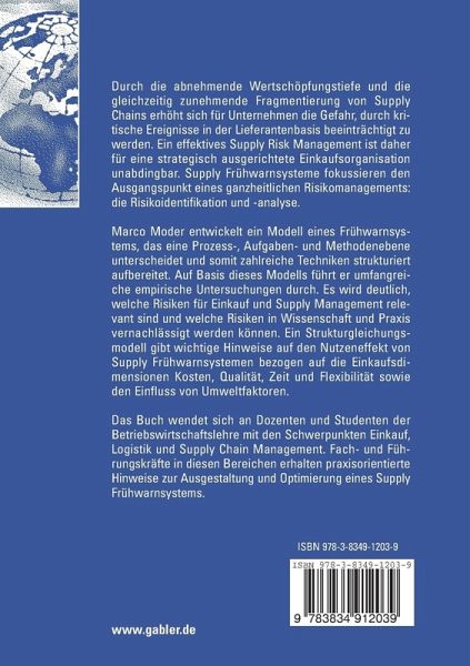 Marco Moder entwickelt ein Modell eines Frühwarnsystems, das eine Prozess-, Aufgaben- und Methodenebene unterscheidet und somit zahlreiche Techniken strukturiert aufbereitet. Auf Basis dieses Modells führt er umfangreiche empirische Untersuchungen durch. Es wird deutlich, welche Risiken für Einkauf und Supply Management relevant sind und welche Risiken in Wissenschaft und Praxis vernachlässigt werden können. Ein Strukturgleichungsmodell gibt wichtige Hinweise auf den Nutzeneffekt von Supply Frühwarnsystemen bezogen auf die Einkaufsdimensionen Kosten, Qualität, Zeit und Flexibilität sowie den Einfluss von Umweltfaktoren.