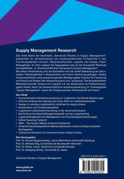 Wissenschaftliche Forschungsbeiträge.- Auswirkungen asymmetrischer Informationsverteilungen in Lieferanten-Abnehmer-Beziehungen.- Kritische Analyse der Eignung des Fuzzy-AHP zur Lieferantenauswahl.- Design of voluntary sustainability initiatives for supply chains.- Koordination von Zuliefernetzwerken.- Logistische Lieferantenentwicklung in der Automobilindustrie.- Der Einfluss der Beschaffungskomplexität auf den Logistikerfolg.- Logistikmanagement als Management von Kontraktlogistikbeziehungen.- Anwendungsnahe Beiträge.- Global Sourcing Footprint.- SMA - The Supply Market Analysis-framework for analysing supply markets within the strategic sourcing process.- Unternehmensübergreifende Bestandsallokation mittels software-basierter Multiagenten-Systeme.- Composite Solutions for Consumer-Driven Supply Chains.