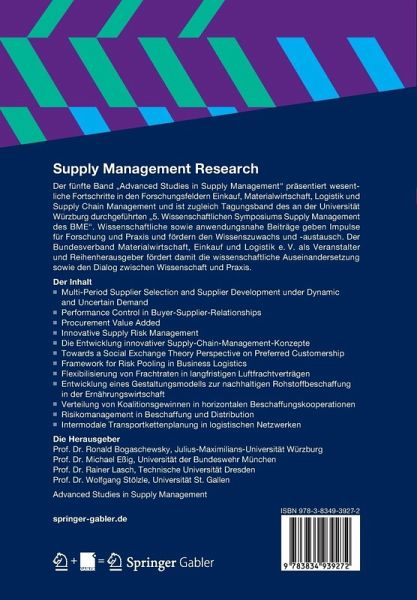 Der fünfte Band "Advanced Studies in Supply Management" präsentiert wesentliche Fortschritte in den Forschungsfeldern Einkauf, Materialwirtschaft, Logistik und Supply Chain Management und ist zugleich Tagungsband des an der Universität Würzburg durchgeführten" 5. Wissenschaftlichen Symposiums Supply Management des BME. Die wissenschaftlichen und anwendungsnahen Beiträge fördern die qualifizierte Auseinandersetzung im Themenbereich.