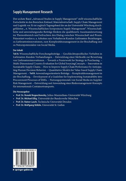 Teil A: Wissenschaftliche Forschungsbeiträge.- Geschlechtsspezifisches Verhalten in Lieferanten-Kunden-Verhandlungen.- Entwicklung einer Methodik zur Bewertung von Lieferanteninnovationen.- Towards a Framework for Strategy in Purchasing.- Multi-Dimensional Country Evaluation for Global Sourcing Concepts.- Innovation in Sustainable Supply Chains.- How to Improve Supply Chain Performance by Anticipating Human Decision Behavior.- Quantitative Models for Value-based Supply Chain Management.- Teil B: Anwendungsorientierte Beiträge.- Komplexitätsmanagement in der Beschaffung.- Development of a Guideline for Implementing Sustainability into Procurement Processes of SMEs.- Nutzungspotenziale von Social Media im Supplier Risk Management.- Entwicklung und Anwendung eines Risikomanagement-Konzepts für internationale Containertransporte.