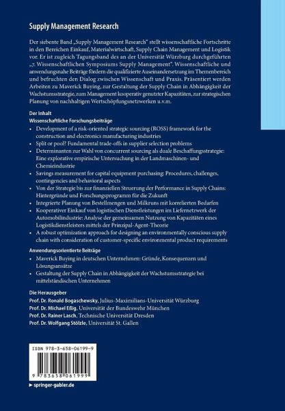 Der siebente Band "Supply Management Research" stellt wissenschaftliche Fortschritte in den Bereichen Einkauf, Materialwirtschaft, Supply Chain Management und Logistik vor. Er ist zugleich Tagungsband des an der Universität Würzburg durchgeführten "7. Wissenschaftlichen Symposiums Supply Management". Wissenschaftliche und anwendungsnahe Beiträge fördern die qualifizierte Auseinandersetzung im Themenbereich und befruchten den Dialog zwischen Wissenschaft und Praxis. Präsentiert werden Arbeiten zu Maverick Buying, zur Gestaltung der Supply Chain in Abhängigkeit der Wachstumsstrategie, zum Management kooperativ genutzter Kapazitäten, zur strategischen Planung von nachhaltigen Wertschöpfungsnetzwerken u.v.m.