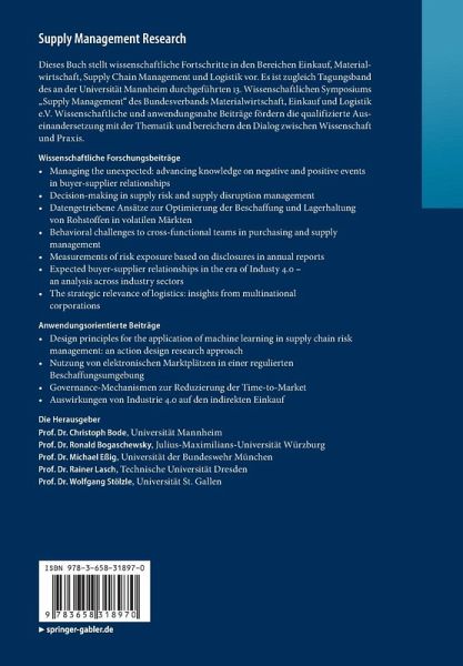 Dieses Buch stellt wissenschaftliche Fortschritte in den Bereichen Einkauf, Materialwirtschaft, Supply Chain Management und Logistik vor. Es ist zugleich Tagungsband des an der Universität Mannheim durchgeführten 13. Wissenschaftlichen Symposiums "Supply Management" des Bundesverbands Materialwirtschaft, Einkauf und Logistik (BME) e.V. Wissenschaftliche und anwendungsnahe Beiträge fördern die qualifizierte Auseinandersetzung mit der Thematik und bereichern den Dialog zwischen Wissenschaft und Praxis.