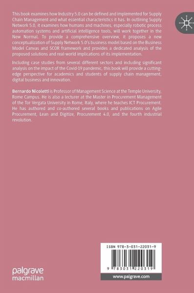 This book examines how Industry 5.0 can be defined and implemented for Supply Chain Management and what essential characteristics it has. In outlining Supply Network 5.0, it examines how humans and machines, especially robotic process automation systems and artificial intelligence tools, will work together in the New Normal. To provide a comprehensive overview, it proposes a new conceptualization of Supply Network 5.0's business model based on the Business Model Canvas and SCOR framework and provides a dedicated analysis of the proposed solutions and real-world implications of its implementation.