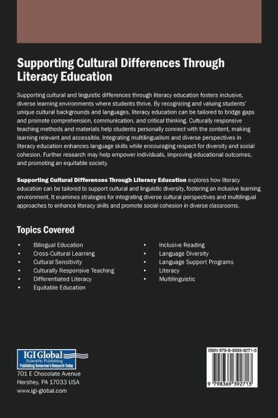 Supporting cultural and linguistic differences through literacy education fosters inclusive, diverse learning environments where students thrive. By recognizing and valuing students' unique cultural backgrounds and languages, literacy education can be tailored to bridge gaps and promote comprehension, communication, and critical thinking. Culturally responsive teaching methods and materials help students personally connect with the content, making learning relevant and accessible. Integrating multilingualism and diverse perspectives in literacy education enhances language skills while encouraging respect for diversity and social cohesion. Further research may help empower individuals, improving educational outcomes, and promoting an equitable society. Supporting Cultural Differences Through Literacy Education explores how literacy education can be tailored to support cultural and linguistic diversity, fostering an inclusive learning environment. It examines strategies for integrating diverse cultural perspectives and multilingual approaches to enhance literacy skills and promote social cohesion in diverse classrooms.