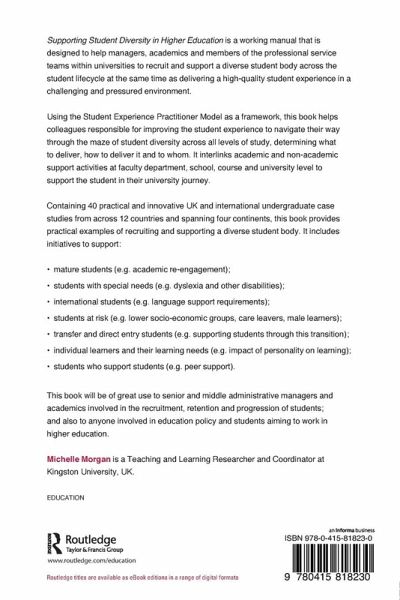 Supporting Student Diversity in Higher Education is a working manual that is designed to help managers, academics and members of the professional service teams within universities, recruit and support a diverse student body across the student lifecycle at the same time as delivering a quality student experience in a challenging and pressured environment. Using the Student Experience Practitioner Model as a framework, this book helps colleagues responsible for improving the student experience navigate their way through the maze of student diversity across all levels of study, determining what to deliver, how to deliver it and to whom. It interlinks academic, welfare and support activities at faculty department, school, course and university level to support the student in their university journey. Containing 40 practical and innovative undergraduate UK and international case studies from across 12 countries spanning four continents, this book provides practical examples of recruiting and supporting a diverse student body. It includes initiatives to support: mature students (e.g. academic re-engagement); students with special needs (e.g. dyslexia and other disabilities); international students (e.g. language support requirements); students at risk (e.g. lower socio-economic groups, care leavers, male learners); Transfer and direct entry students (e.g. supporting students through this transition); individual learners and their learning needs (impact of personality on learning); students who support students (e.g. peer support). This book will be of great use to senior and middle administrative managers and academics involved in the recruitment, retention and progression of students; and also to anyone involved in education policy and students aiming to work in higher education.