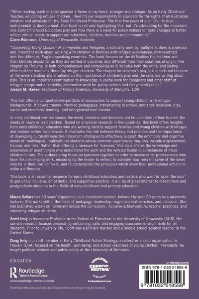 "Supporting Young Children of Immigrants and Refugees, a scholarly work by multiple authors is a serious and important work about working with children in families with refugee experiences, now resettled into five different, English-speaking countries. The book focuses on the difficulties the children and their families encounter as they are settled in countries very different from their countries of origin. The chapter on 'Trauma' is both comprehensive and compelling as it includes both the initial and lasting effects of the trauma suffered by refugee children. The chapter on children's play also stands out because of the understanding and emphasis on the importance of children's play and the sensitive writing about play. This is an important contribution to knowledge, a useful work for caregivers and other staff at refugee camps and a readable, informative work for policy makers and the general public."