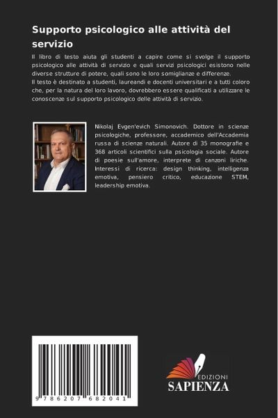 Il libro di testo aiuta gli studenti a capire come si svolge il supporto psicologico alle attività di servizio e quali servizi psicologici esistono nelle diverse strutture di potere, quali sono le loro somiglianze e differenze.Il testo è destinato a studenti, laureandi e docenti universitari e a tutti coloro che, per la natura del loro lavoro, dovrebbero essere qualificati a utilizzare le conoscenze sul supporto psicologico delle attività di servizio.