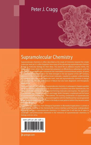 Following an overview of supramolecular chemistry, the first section considers the efforts made to synthesize artificial systems that mimic biological entities. The second section addresses the application of supramolecular principles to molecular diagnostics with a particular emphasis on the 'receptor-relayreporter' motif. Many of the examples chosen have clinical importance. The third section takes the clinical diagnostic theme further and demonstrates the therapeutic applications of supramolecular chemistry through photodynamic therapy, drug delivery, and the potential for synthetic peptides to form antibiotic tubes. The short epilogue considers the potential for supramolecular solutions to be found for further challenges in biomimetic and therapeutic chemistry.