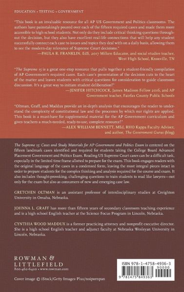 This book is centered on the fifteen landmark cases as identified and required for students taking the College Board Advanced Placement® Government and Politics Exam. Reading U.S. Supreme Court cases can be a difficult task, especially in the limited time frame allotted to prepare for the exam. In keeping with the College Board's admonition that students be able to read and understand the high-level language of primary sources, this book engages readers with the original language of the cases in a condensed form with the most integral pieces intact in order to prepare students for the complex thinking and analysis required for the course and the exam. More than simple summaries, these cases maintain the original language and include thought-provoking, challenging, questions to train readers to read like lawyers, not only for the exam, but for the rest of their lives as consumers of new and emerging case law.