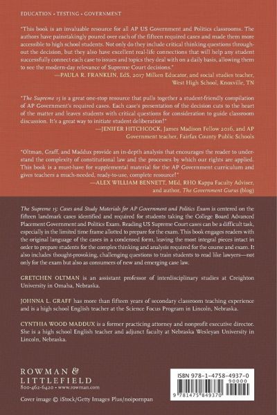 This book is centered on the fifteen landmark cases as identified and required for students taking the College Board Advanced Placement® Government and Politics Exam. Reading U.S. Supreme Court cases can be a difficult task, especially in the limited time frame allotted to prepare for the exam. In keeping with the College Board's admonition that students be able to read and understand the high-level language of primary sources, this book engages readers with the original language of the cases in a condensed form with the most integral pieces intact in order to prepare students for the complex thinking and analysis required for the course and the exam. More than simple summaries, these cases maintain the original language and include thought-provoking, challenging, questions to train readers to read like lawyers, not only for the exam, but for the rest of their lives as consumers of new and emerging case law.