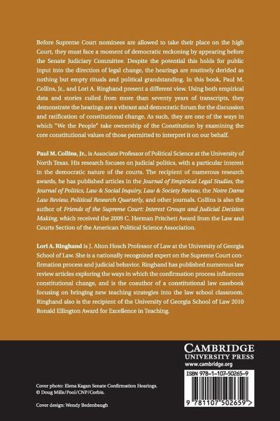 Before Supreme Court nominees are allowed to take their place on the High Court, they must face a moment of democratic reckoning by appearing before the Senate Judiciary Committee. Despite the potential this holds for public input into the direction of legal change, the hearings are routinely derided as nothing but empty rituals and political grandstanding. In this book, Paul M. Collins and Lori A. Ringhand present a contrarian view that uses both empirical data and stories culled from more than seventy years of transcripts to demonstrate that the hearings are a democratic forum for the discussion and ratification of constitutional change. As such, they are one of the ways in which 'We the People' take ownership of the Constitution by examining the core constitutional values of those permitted to interpret it on our behalf.