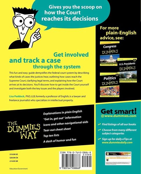 Gives you the scoop on how the Court reaches its decisions Get involved and track a case through the system This fun and easyguide demystifies the federal court system by describing what kinds of cases the justices hear, outlining how cases reach the Supreme Court, clarifying legal terms, and explaining how the Court arrives at its decisions. Youll discover how to get inside the Court yourself and investigate both the key issues and the players involved. The Dummies Way * Explanations in plain English * ' Get in, get out' information * Icons and other navigational aids * Tear-out cheat sheet * Top ten lists * A dash of humor and fun