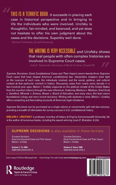Supreme Decisions: Great Constitutional Cases and Their Impact, Volumes 1 and 2, covers twenty-four Supreme Court cases that have shaped American constitutional law. Interpretive chapters shed light on the nuances of each case, the individuals involved, and the social, political, and cultural context at that particular moment in history.