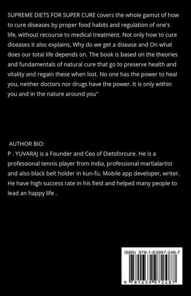 SUPREME DIETS FOR SUPER CURE covers the whole gamut of how to cure diseases by proper food habits and regulation of one's life, without recourse to medical treatment. Not only how to cure diseases it also explains, Why do we get a disease and On what does our total life depends on. The book is based on the theories and fundamentals of natural cure that go to preserve health and vitality and regain these when lost. No one has the power to heal you, neither doctors nor drugs have the power. It is only within you and in the nature around you''