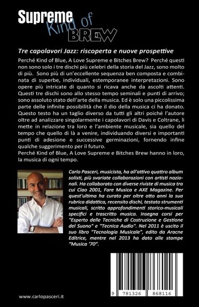 Perché Kind of Blue, A Love Supreme e Bitches Brew? Perché questi non sono solo i tre dischi più celebri della storia del Jazz, sono molto di più. Sono più di un'eccellente sequenza ben composta e combinata di superbe, individuali, estemporanee interpretazioni. Sono opere più intricate di quanto si ricava anche da ascolti attenti. Questi tre dischi sono allo stesso tempo seminali e punti di arrivo; sono assoluto stato dell'arte della musica. Ed è solo una piccolissima parte delle infinite possibilità che il dio della musica ci ha donato. Questo testo ha un taglio diverso da tutti gli altri poiché l'autore oltre ad analizzare singolarmente i capolavori di Davis e Coltrane, li mette in relazione tra loro e l'ambiente musicale, sia quello del tempo che quello di là a venire, individuando diversi e importanti punti di adesione e successive germinazioni, fornendo infine qualche suggerimento per il futuro. Perché Kind of Blue, A Love Supreme e Bitches Brew hanno in loro, la musica di ogni tempo. Indice dei contenuti: - Introduzione - Kind of Blue - A Love Supreme - Bitches Brew - L'eredità di tre capolavori - Universalismo sonoro - Moderno elementarismo - Linee direttrici "generiche" di sviluppo del Jazz - Appendice A - Tonale e Modale - Appendice B - Improvvisazione: la specificità del Jazz - Appendice C - La batteria e il ritmo