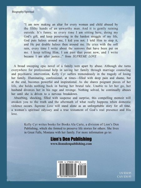 True story of woman trying to get free of abusive husband and finds God. All Kelly Cyr wanted was a loving marriage, a happy family and a good home. A nurse with a handicapped child, she met and fell in love with Kane Cyr, a logger who already had two marriages behind him and three children who also stole her heart. What happens during their courtship and marriage should never happen to any woman. This is the harrowing account of a battered woman who tries to get free. It is not so much the battle through the relationship that is horrendous, but the never-ending aftermath and the unbelievable events that occur. No one is perfect and she makes many mistakes. Her life falling apart, she is driven to a nervous break-down from Kane's ongoing abuse. God speaks to her. Heartbroken, she builds an altar for battered women and children. Through amazing spiritual revelation, she knows what she has to do. Shocking, filled with suspense and surprise, this compelling and intense autobiography will awaken you to the truth about domestic violence. Kelly Cyr's divorce cost her everything but her life. Because of a vow she made to God, she is now on a mission to help battered women and children. Supreme Love should stand alone as an unforgettable story for all time, a woman's spiritual odyssey and a true testament to what happens to a battered woman.