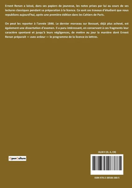 Ernest Renan a laissé, dans ses papiers de jeunesse, les notes prises par lui au cours de ses lectures classiques pendant sa préparation à la licence. Ce sont ces travaux d¿étudiant que nous republions aujourd¿hui, après une première édition dans les Cahiers de Paris. On peut les reporter à l¿année 1846. Le dernier morceau sur Bossuet, déjà plus achevé, est également une dissertation d¿examen. Il a paru intéressant, en conservant à ces fragments leur caractère spontané et jusqüà leurs négligences, de mettre au jour la manière dont Ernest Renan préparait ¿ avec ardeur ¿ le programme de la licence ès lettres.