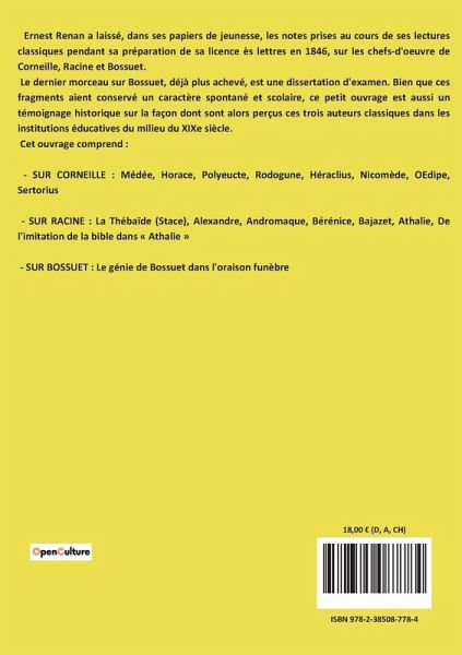 Ernest Renan a laissé, dans ses papiers de jeunesse, les notes prises au cours de ses lectures classiques pendant sa préparation de sa licence ès lettres en 1846, sur les chefs-d'oeuvre de Corneille, Racine et Bossuet. Le dernier morceau sur Bossuet, déjà plus achevé, est une dissertation d'examen. Bien que ces fragments aient conservé un caractère spontané et scolaire, ce petit ouvrage est aussi un témoignage historique sur la façon dont sont alors perçus ces trois auteurs classiques dans les institutions éducatives du milieu du XIXe siècle. Cet ouvrage comprend : - SUR CORNEILLE : Médée, Horace, Polyeucte, Rodogune, Héraclius, Nicomède, OEdipe, Sertorius - SUR RACINE : La Thébaïde (Stace), Alexandre, Andromaque, Bérénice, Bajazet, Athalie, De l'imitation de la bible dans « Athalie » - SUR BOSSUET : Le génie de Bossuet dans l'oraison funèbre