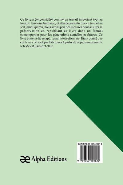 Sur la pierre blanche, est un livre classique et rare, qui a été considéré comme important tout au long de l'histoire de l'humanité, et pour que cet ouvrage ne soit jamais oublié, chez Alpha Editions, nous avons fait des efforts pour sa préservation en rééditant ce livre dans un format moderne pour les générations présentes et futures. . Tout ce livre a été reformaté, retapé et repensé. Ces livres ne sont pas constitués de copies numérisées de leur ¿uvre originale et leur texte est donc clair et lisible. Ce volume remarquable s'inscrit dans les genres de Language and Literatures Romance literatures French, Italian, Spanish, Portuguese