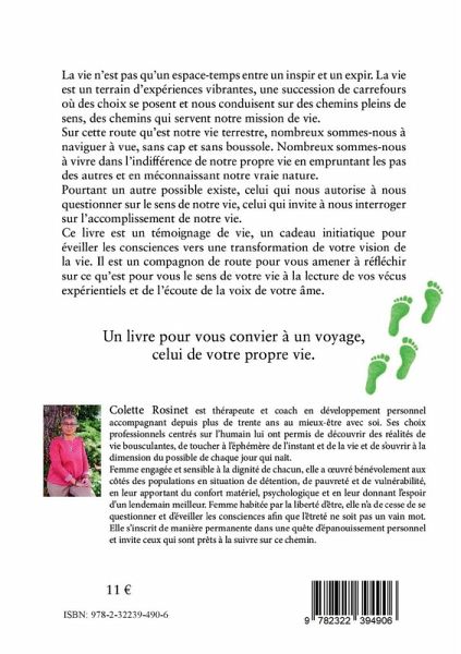 La vie n'est pas qu'un espace-temps entre un inspir et un expir. La vie est un terrain d'expériences vibrantes, une succession de carrefours où des choix se posent et nous conduisent sur des chemins pleins de sens, des chemins qui servent notre mission de vie.Sur cette route qu'est notre vie terrestre, nombreux sommes-nous à naviguer à vue, sans cap et sans boussole. Nombreux sommes-nous à vivre dans l'indifférence de notre propre vie en empruntant les pas des autres et en méconnaissant notre vraie nature.Pourtant un autre possible existe, celui qui nous autorise à nous questionner sur le sens de notre vie, celui qui invite à nous interroger sur l'accomplissement de notre vie.Ce livre est un témoignage de vie, un cadeau initiatique pour éveiller les consciences vers une transformation de votre vision de la vie. Il est un compagnon de route pour vous amener à réfléchir sur ce qu'est pour vous le sens de votre vie à la lecture de vos vécus expérientiels et de l'écoute de la voix de votre âme.