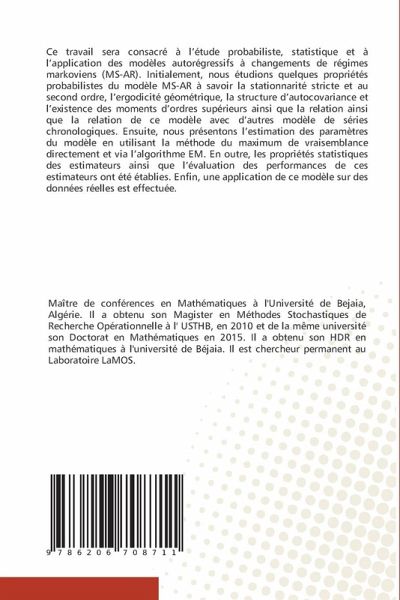 Ce travail sera consacré à l'étude probabiliste, statistique et à l'application des modèles autorégressifs à changements de régimes markoviens (MS-AR). Initialement, nous étudions quelques propriétés probabilistes du modèle MS-AR à savoir la stationnarité stricte et au second ordre, l'ergodicité géométrique, la structure d'autocovariance et l'existence des moments d'ordres supérieurs ainsi que la relation ainsi que la relation de ce modèle avec d'autres modèle de séries chronologiques. Ensuite, nous présentons l'estimation des paramètres du modèle en utilisant la méthode du maximum de vraisemblance directement et via l'algorithme EM. En outre, les propriétés statistiques des estimateurs ainsi que l'évaluation des performances de ces estimateurs ont été établies. Enfin, une application de ce modèle sur des données réelles est effectuée.