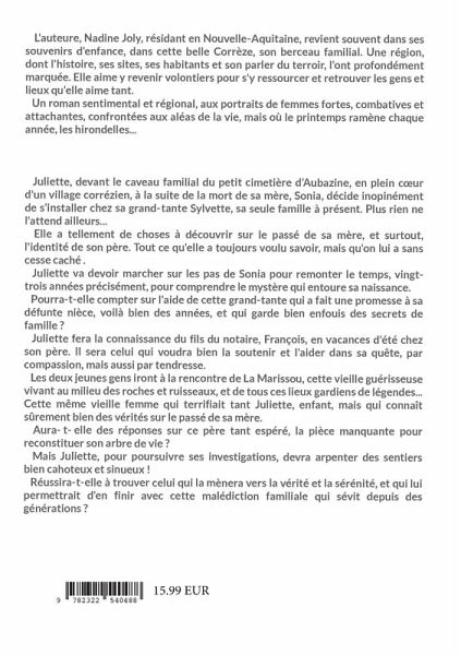 Juliette, devant le caveau familial du petit cimetière d'Aubazine, en plein coeur d'un village corrézien, à la suite de la mort de sa mère, Sonia, décide inopinément de s'installer chez sa grand-tante Sylvette, sa seule famille à présent. Plus rien ne l'attend ailleurs... Elle a tellement de choses à découvrir sur le passé de sa mère, et surtout, l'identité de son père. Tout ce qu'elle a toujours voulu savoir, mais qu'on lui a sans cesse caché ! Juliette va devoir marcher sur les pas de Sonia pour remonter le temps, vingt-trois années précisément, pour comprendre le mystère qui entoure sa naissance. Pourra-t-elle compter sur l'aide de cette grand-tante qui a fait une promesse à sa défunte nièce, voilà bien des années, et qui garde bien enfouis des secrets de famille ? Juliette fera la connaissance du fils du notaire, François, en vacances d'été chez son père. Il sera celui qui voudra bien la soutenir et l'aider dans sa quête, par compassion, mais aussi par tendresse. Les deux jeunes gens iront à la rencontre de La Marissou, cette vieille guérisseuse vivant au milieu des roches et ruisseaux, et de tous ces lieux gardiens de légendes... Cette même vieille femme qui terrifiait tant Juliette, enfant, mais qui connaît certainement bien des vérités sur le passé de sa mère. Aura-t-elle des réponses sur ce père tant espéré, la pièce manquante pour reconstituer son arbre de vie ? Mais Juliette, pour poursuivre ses investigations, devra arpenter des sentiers bien cahoteux et sinueux ! Réussira-t-elle à trouver celui qui la mènera vers la vérité et la sérénité, et qui lui permettrait d'en finir avec cette malédiction familiale qui sévit depuis des générations ?