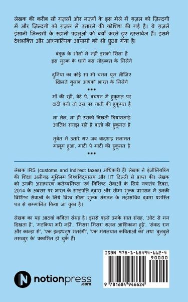 This book contains 101 gazals and poems, in which a myriad of human emotions have been painted be it love, hate, anger, revolt, helplessness and jealousy. It is an attempt to fill an entire ocean of life in a pot of gazals. The readers will find gazals on patriotism, Bharat, dil (heart), khuda (God), mother, father, brother, rain, clouds, space, moon, Taj Mahal, Chandni and what not.
