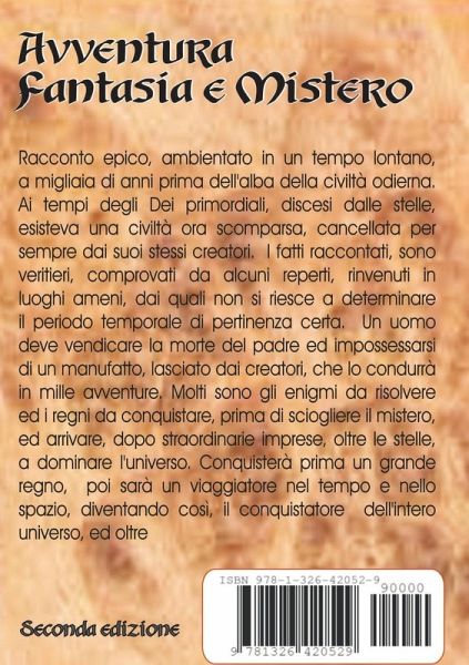 Racconto epico, ambientato in un tempo lontano, a migliaia di anni prima dell'alba della civiltà odierna. - Ai tempi degli Dei primordiali, discesi dalle stelle, esisteva una civiltà ora scomparsa, cancellata per sempre, dai suoi stessi creatori. I fatti raccontati, sono veritieri, comprovati da alcuni reperti, rinvenuti in luoghi ameni, dai quali non si riesce a determinare il periodo temporale di pertinenza certa. Questi reperti sono celati dai loro scopritori, per non riscrivere la storia. - Un uomo deve vendicare la morte del padre ed impossessarsi di un manufatto, lasciato dai creatori. Questa ricerca, lo condurrà in mille avventure. Molti saranno gli enigmi da risolvere ed i regni da conquistare, prima di sciogliere il mistero ed arrivare, dopo straordinarie imprese, oltre le stelle, a dominare l'universo. Conquisterà dapprima un grande regno, poi diverrà un viaggiatore nel tempo e nello spazio, divenendo così, il conquistatore dell'intero universo, ed oltre...