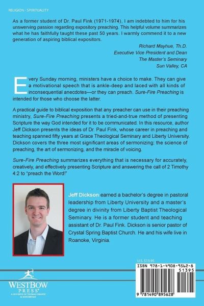 Every Sunday morning, ministers have a choice to make. They can give a motivational speech that is ankle-deep and laced with all kinds of inconsequential anecdotes-or they can preach. Sure-Fire Preaching is intended for those who choose the latter. A practical guide to biblical exposition that any preacher can use in their preaching ministry, Sure-Fire Preaching presents a tried-and-true method of presenting Scripture the way God intended for it to be communicated. In this resource, author Jeff Dickson presents the ideas of Dr. Paul Fink, whose career in preaching and teaching spanned fifty years at Grace Theological Seminary and Liberty University. Dickson covers the three most significant areas of sermonizing: the science of preaching, the art of sermonizing, and the miracle of voicing. Sure-Fire Preaching summarizes everything that is necessary for accurately, creatively, and effectively presenting Scripture and answering the call of 2 Timothy 4:2 to "preach the Word!"
