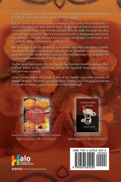 As the daughter of Cuban parents who immigrated to the United States in 1949, I was raised on the foods of their country.But as I grew up and became a teenager, my taste was satisfied by a daily cheeseburger and french fries. At the age of fifteen, my mother would tell me it was time for me to learn how to cook because one day, I would have a family, and I would need to feed them some real food. I laughed it off and assured her that I would study and work hard and be able to afford someone to cook for me. She was right, I did all the things I promised, but once I did have a family, I looked back to my roots to provide for them. I found I enjoyed cooking and not only the foods of my country on Thanksgiving Day but also the traditional Cuban foods of Noche Buena.As the years have gone by, my family has become more American than Cuban. Many in my family are losing the Spanish language, yet they still love my cooking.I have preserved in this book a few of my family's favorite recipes to ensure that my children, grandchildren, family, and future generations I will never meet, retain the food of their heritage.