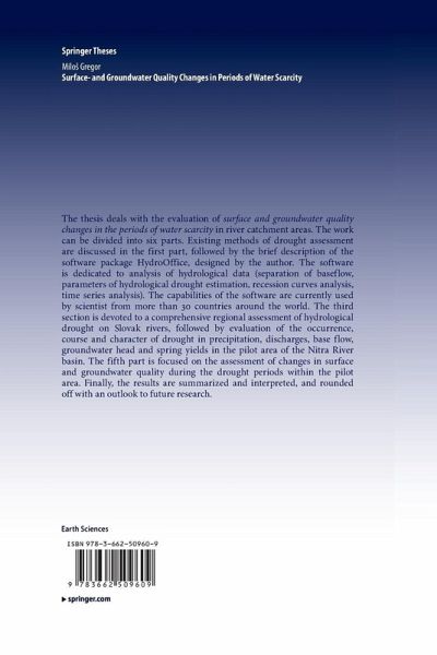 This thesis deals with the evaluation of surface and groundwater quality changes in the periods of water scarcity in river catchment areas. The work can be divided into six parts. Existing methods of drought assessment are discussed in the first part, followed by the brief description of the software package HydroOffice, designed by the author. The software is dedicated to analysis of hydrological data (separation of baseflow, parameters of hydrological drought estimation, recession curves analysis, time series analysis). The capabilities of the software are currently used by scientist from more than 30 countries around the world. The third section is devoted to a comprehensive regional assessment of hydrological drought on Slovak rivers, followed by evaluation of the occurrence, course and character of drought in precipitation, discharges, base flow, groundwater head and spring yields in the pilot area of the Nitra River basin. The fifth part is focused on the assessment of changes in surface and groundwater quality during the drought periods within the pilot area. Finally, the results are summarized and interpreted, and rounded off with an outlook to future research.