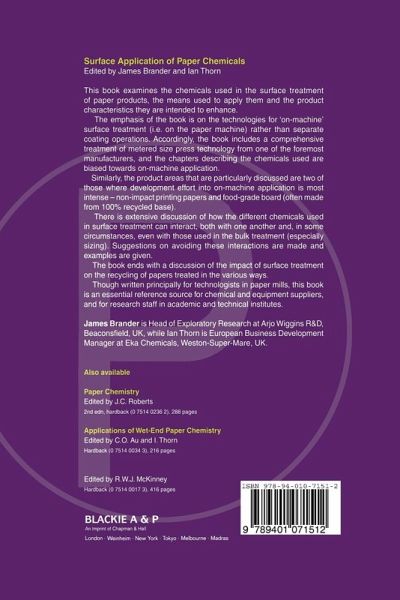 Background.- Technology of on-machine application.- Chemicals for surface application.- Paper products and surface treatment.- 1 On-machine surface treatment of paper and board with the blade coater.- 1.1 The origins of on-machine surface treatment.- 1.2 The blade-coating system today.- 1.3 Advantages and disadvantages of on-machine surface treatment.- 1.4 Paper and board grades utilizing on-machine surface treatment.- 1.5 Designing the surface treatment line.- 1.6 Examples.- 2 On-machine surface treatment of paper and board with the film press.- 2.1 Introduction.- 2.2 Quality and runnability aspects of different surface sizing processes.- 2.3 New generation film presses.- 2.4 Coat-weight development and metering-element-related phenomena.- 2.5 Film transfer at film-press nip.- 2.6 Precalendering.- 2.7 Control of paper quality.- 2.8 Nip mechanics and roll covers.- 2.9 Quality differences between film-press and blade coated sheets.- 2.10 The SymSizer film press.- References.- 3 Synthetic latex binders for paper manufacture.- 3.1 Introduction.- 3.2 From molecule to particle: latex synthesis.- 3.3 From particles to dispersion: latex stability.- 3.4 The viscosity of latices and coating colors: the novel contribution of the particle state.- 3.5 From particle to film: latex coalescence.- 3.6 From latex to coated paper: the role of polymers in a paper coating.- 3.7 Conclusions.- References.- 4 Starches.- 4.1 Introduction.- 4.2 Principles of starch technology.- 4.3 Starch modification.- 4.4 Surface application methods.- 4.5 Starch properties required for size-press application.- 4.6 Starch properties required for metered size-press application.- 4.7 Starch properties required for blade application and as a coating colour binder.- 4.8 Starch properties required when applied by liquid application system.- 4.9 Size-press starch application to waste-based packaging paper.- 5 Rheology modifiers and pigment dispersants.- 5.1 Introduction.- 5.2 General principles of viscosity and rheology.- 5.3 Flow types encountered in paper surface treatment.- 5.4 Variation of shear stress during surface application.- 5.5 Water retention.- 5.6 Types of rheology modifier.- 5.7 Pigment dispersants.- 5.8 Interactions.- References.- 6 Pigments for on-line surface treatment.- 6.1 Introduction.- 6.2 The pigments.- 6.3 Application.- 6.4 General paper improvement.- 6.5 Conclusions.- References.- 7 Surface sizing.- 7.1 Definition and overview.- 7.2 Chemicals applied at the surface.- 7.3 Function of the products.- 7.4 End-use properties.- 7.5 Interactions and possible problems.- References.- 8 Surface brightening of paper.- 8.1 Introduction.- 8.2 Spectra of different illuminants.- 8.3 The quantification of the effectiveness of fluorescent brightening agents.- 8.4 The chemical nature of fluorescent brightening agents.- 8.5 Application of fluorescent brightening agents to paper.- 8.6 Impairment of fluorescent brightening agents: greening and quenching.- 8.7 Lightfastness.- 8.8 Recycling.- 8.9 Monitoring and control of surface brightened paper.- 8.10 Toxicology and ecotoxicity of fluorescent brightening agents.- 8.11 Summary of the effects and influences on surface addition of fluorescent brightening agents to paper.- Acknowledgements.- References.- 9 On-machine surface coloration.- 9.1 Introduction.- 9.2 Size-press dyeing.- 9.3 Dyes used in on-machine coating.- 9.4 Calender stack dyeing.- 9.5 Spraying.- 9.6 Broke treatment.- 9.7 Survey of surface dyeing.- 9.8 Conclusions.- Acknowledgements.- References.- Further reading.- 10 The surface treatment of fine business papers.- 10.1 Introduction.- 10.2 Non-impact printing.- 10.3 The chemical natures of non-impact printing image-forming materials.- 10.4 Paper requirements for non-impact printing.- 10.5 Surface treatment for non-impact printing papers.- 10.6 Surface application methods.- 10.7 Summary.- Acknowledgement.- References.- Further reading.- 11 Barrier dispersion coating of paper and board.- 11.1 Dispersion coating in general.- 11.2 Film formation.- 11.3 Commonly measured film properties.- 11.4 Heat sealing, blocking and gluing.- 11.5 Products.- 11.6 Disposal of dispersion coated papers.- References.- 12 Recycling surface treated paper products.- 12.1 Introduction.- 12.2 Recycling surface treated paper products.- 12.3 Stock Preparation and the impact of surface treatment chemicals.- 12.4 Summary of the effects of surface treated papers on recycling.- References.