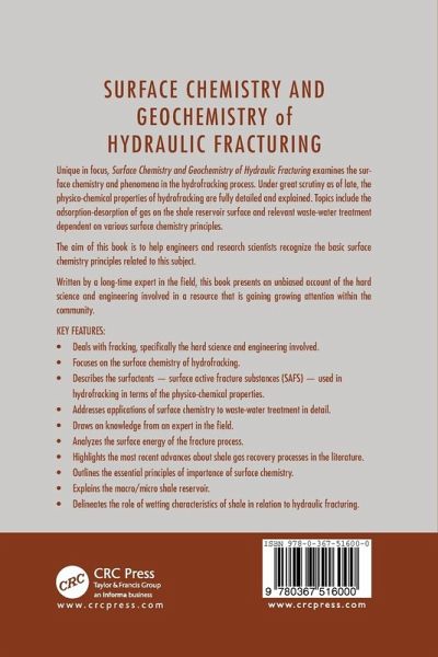 Unique in focus, Surface Chemistry and Geochemistry of Hydraulic Fracturing examines the surface chemistry and phenomena in the hydrofracking process. Under great scrutiny as of late, the physico-chemical properties of hydrofracking are fully detailed and explained. Topics include the adsorption-desorption of gas on the shale reservoir surface and relevant waste-water treatment dependent on various surface chemistry principles. The aim of this book is to help engineers and research scientists recognize the basic surface chemistry principles related to this subject. Written by a long-time expert in the field, this book presents an unbiased account of the hard science and engineering involved in a resource that is gaining growing attention within the community.