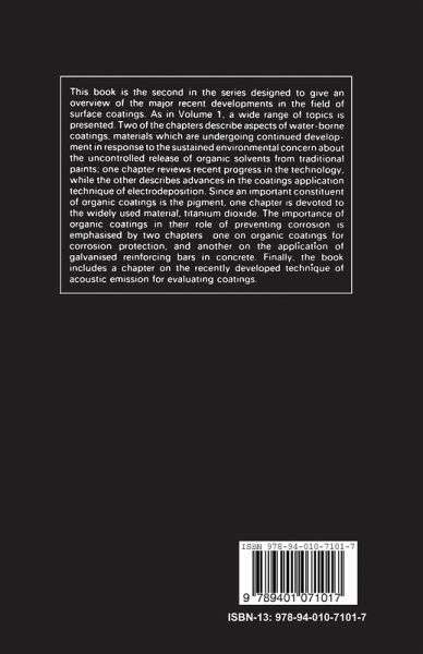 The science and technology of surface coatings continues to advance. Among the key areas are polymer chemistry, as new binders are developed to meet increasingly stringent environmental demands; testing and evaluation, as the need to understand the factors affecting coatings performance becomes ever more intense; and studies of that enduring problem, corrosion of metal substrates, from which coatings of ever improving effectiveness are emerging. We have in this present volume of the series continued to cover aspects of these numerous developments. There are chapters on waterborne paint, a subject of increasing environmental importance, by J. W. Nicholson, and by H.-J. Streitberger and R. P. Osterloh; on a new and sophisticated test method, acoustic emission (R. D. Rawlings); and on anticorrosion coatings both organic (W. Funke) and inorganic (M. C. Andrade and A. Macias). Finally, that topic of immense practical importance to paint technology, pigmentation, is covered in a chapter by the late T. Entwistle. All the authors have brought considerable experience in their chosen field of coatings technology to the preparation of their chapters, all of which are timely reviews of developing topics. We are grateful to each author for helping in the preparation of this volume, and for putting their experience at the disposal of the wide audience for whom this book is intended.