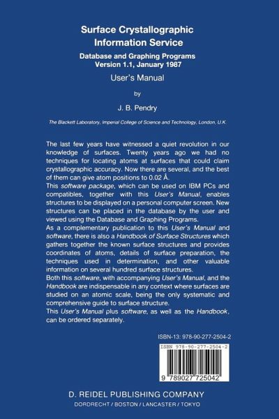 1. General Description.- 2. Getting Started.- 2.1 Expanding the Database.- 2.2 Setting up the Program.- 3. The Main Utilities menu.- 3.1 Selecting Input and Output Files.- 3.2 Defining the Current Set of Structures.- 3.3 Filing the Current Set of Structures.- 3.4 Printing a Structure.- 3.5 Listing a Structure.- 4. The Main Editing and Input Menu.- 4.1 Selecting an Old Structure.- 4.2 Revising a Structure.- 4.3 Filing.- 4.4 Testing for Inconsistencies.- 5. Using the Graphing Program.- 5.1 First Entry into the Graphing Routines.- 5.2 Changing the Euler Angles.- 5.3 Changing the Central Atom.- 5.4 Changing the Distance.- 5.5 Magnification.- 5.6 Removing the Atoms.- 5.7 Colour.- 5.8 Perspective.- 5.9 Labeling the Figure.- 5.10 Free Rotation of the Figure.- 6. Completing the Standard Structure Form.- 6.1 General Description of the Form.- 6.2 Completion of the Optional Boxes.- 6.3 Completion of the Mandatory Boxes.- 6.4 Filing the Standard Structure Form.