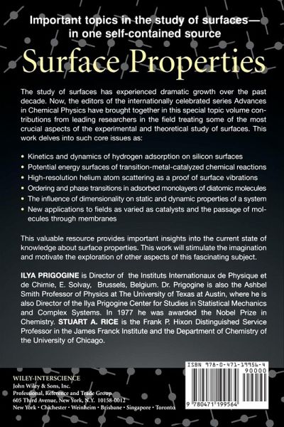 The study of surfaces has experienced dramatic growth over the past decade. Now, the editors of the internationally celebrated series Advances in Chemical Physics have brought together in this special topic volume contributions from leading researchers in the field treating some of the most crucial aspects of the experimental and theoretical study of surfaces. This work delves into such core issues as: * Kinetics and dynamics of hydrogen adsorption on silicon surfaces * Potential energy surfaces of transition-metal-catalyzed chemical reactions * High-resolution helium atom scattering as a proof of surface vibrations * Ordering and phase transitions in adsorbed monolayers of diatomic molecules * The influence of dimensionality on static and dynamic properties of a system * New applications to fields as varied as catalysts and the passage of molecules through membranes. This valuable resource provides important insights into the current state of knowledge about surface properties. This work will stimulate the imagination and motivate the exploration of other aspects of this fascinating subject.