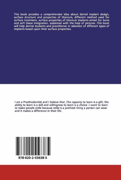 This book provides a comprehensive idea about dental implant design, surface structure and properties of titanium, different method used for surface treatment, surface properties of titanium implants aimed for bone and soft tissue integration, explained with the help of pictures .This book will help dental students and practitioner in selection of different types of implants based upon their surface properties.