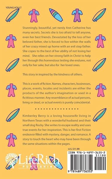 Stunningly, beautiful, yet nerdy Ann Catherine has many secrets. Secrets she is too afraid to tell anyone, even her best friends. Devastated by the loss of her beloved father, she is forced to live within the walls of her crazy mixed up home with an evil step father. She copes to the best of her ability of not losing her mind. She relies on her strong faith in Christ to help her through this horrendous testing she endures, not only for her sake, but also for her loved ones. This story in inspired by the kindness of others. This is a work of fiction. Names, characters, businesses, places, events, locales and incidents are either the products of the author's imagination or used in a fictitious manner. Any resemblance of actual persons, living or dead, or actual events is purely coincidental.