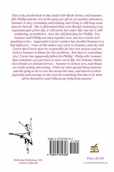 Summer is off again, traveling and competing in open water swim competitions and surfing whenever she can. A great white has been sited at the pier, and this affects Summer's ability to swim and surf in the ocean at home. Carrie is starting to act very strangely, and Phillip says something is wrong with Carrie and maybe Summer should move on because sometimes that's just what people have to do. Summer doesn't understand this because she thought best friends were forever because that's just the kind of girl Summer is. Every day Summer is growing stronger and more independent, and her mother is accepting things much better now, even though she still worries about Summer and feels that Summer is just doing too much, especially with Summer's heightened training schedule. Coach Tammy and her godmother and open water training coach, Jill, also decide it is time for Summer to move to a new swim team, and this is a very difficult thing for Summer to do because it means she must leave her old swim friends behind in favor of more intensive training on a new swim team. Something very big and exciting then happens that is to become a new part of Summer's legacy, and she ends up having an exciting adventure that is quite unexpected. Hardcover copy available, ISBN 0-9776993-1-5, cover price $21.95 USD