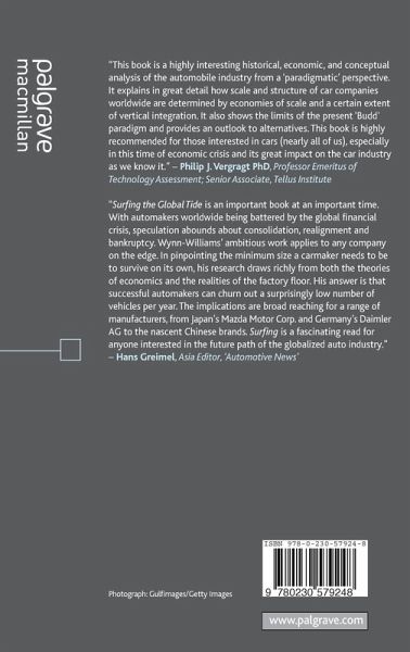 'Surfing the Global Tide' is an important book at an important time. With automakers worldwide being battered by the global financial crisis, speculation abounds about consolidation, realignment and bankruptcy. Wynn-Williams' ambitious work applies to any company on the edge. In pinpointing the minimum size a carmaker must be to survive on its own, his research draws richly from both the theories of economics and the realities of the factory floor. His answer is that successful automakers can churn out a surprisingly low number of vehicles per year. The implications are broad reaching for a range of manufacturers, from Japan's Mazda Motor Corp. and Germany's Daimler AG to the nascent Chinese brands. 'Surfing' is fascinating read for anyone interested in the future path of the globalized auto industry.' - Hans Greimel, Asia Editor, Automotive News