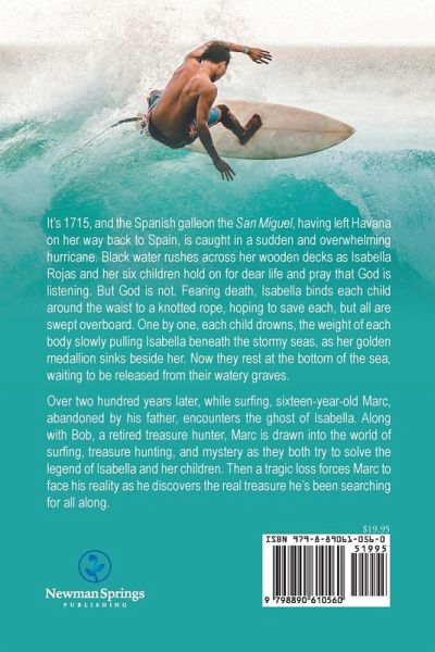 It's 1715, and the Spanish galleon the San Miguel, having left Havana on her way back to Spain, is caught in a sudden and overwhelming hurricane. Black water rushes across her wooden decks as Isabella Rojas and her six children hold on for dear life and pray that God is listening. But God is not. Fearing death, Isabella binds each child around the waist to a knotted rope, hoping to save each, but all are swept overboard. One by one, each child drowns, the weight of each body slowly pulling Isabella beneath the stormy seas, as her golden medallion sinks beside her. Now they rest at the bottom of the sea, waiting to be released from their watery graves. Over two hundred years later, while surfing, sixteen-year-old Marc, abandoned by his father, encounters the ghost of Isabella. Along with Bob, a retired treasure hunter, Marc is drawn into the world of surfing, treasure hunting, and mystery as they both try to solve the legend of Isabella and her children. Then a tragic loss forces Marc to face his reality as he discovers the real treasure he's been searching for all along.